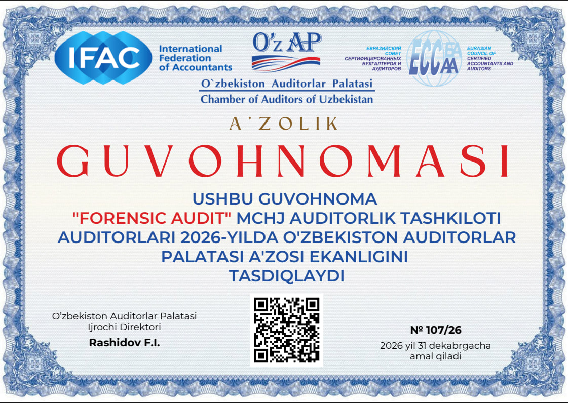 АО ООО «FORENSIC AUDIT», является первой аудиторской организацией в Узбекистане с основным видом деятельности Форензик. Компания, которая просвещает в Узбекистане Форензик процедуры, издает тематические статьи и проводит обучающие семинары с учетом знаний и опыта, полученного от Международной ассоциации ACFE.